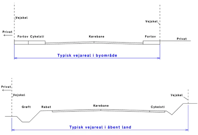 Vejarealet er typisk afgrænset som illustreret herunder, men kan også være parkeringspladser, gågader, torvearealer med mere.